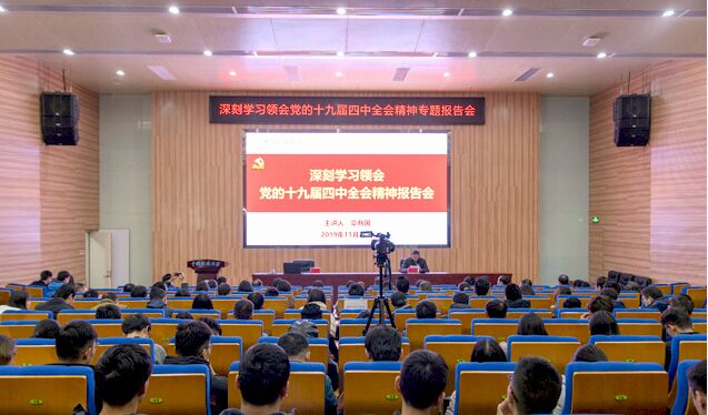 (记者霍少孟)11月28日,深入学习领会党的十九届四中全会精神专题报告会在永利官网报告厅举行,湖北省委宣传团成员、湖北省委政策研究室副主任章新国同志作宣讲报告,永利官网全体院领导、院直支部、信安支部、网工支部、部分学生支部的党员和新校区各学院260余名干部师生聆听报告。校党委副书记、纪委书记成金华主持报告会。