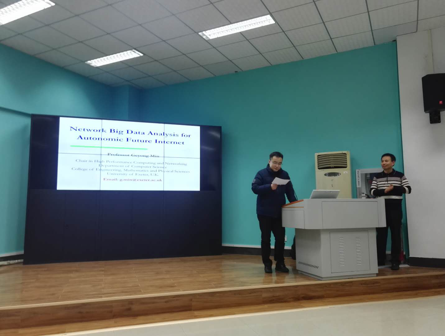 1月2日,应yl6809永利官网院长王力哲教授的邀请,英国Exeter大学(计算机学科首席教授)闵革勇教授来院访问,并做了题为“Network Big Data Analysis for Future Intelligent Internet”的学术报告。闵革勇教授在计算机/通信学科的IEEE与ACM国际顶级期刊上发表学术论文140余篇,多次获得会议最佳论文奖,现任6个国际期刊的编委(含计算机学科顶级国际期刊IEEE Transactions on Computers),18个国际期刊专刊的编辑,先后担任了18个国际会议/研讨会的大会主席和程序委员会主席,80多个国际学术会议的程序委员会委员,并在多个国际学术会议与研讨会上做大会特邀主题报告。学术报告在王力哲教授的郑重介绍下正式开始。