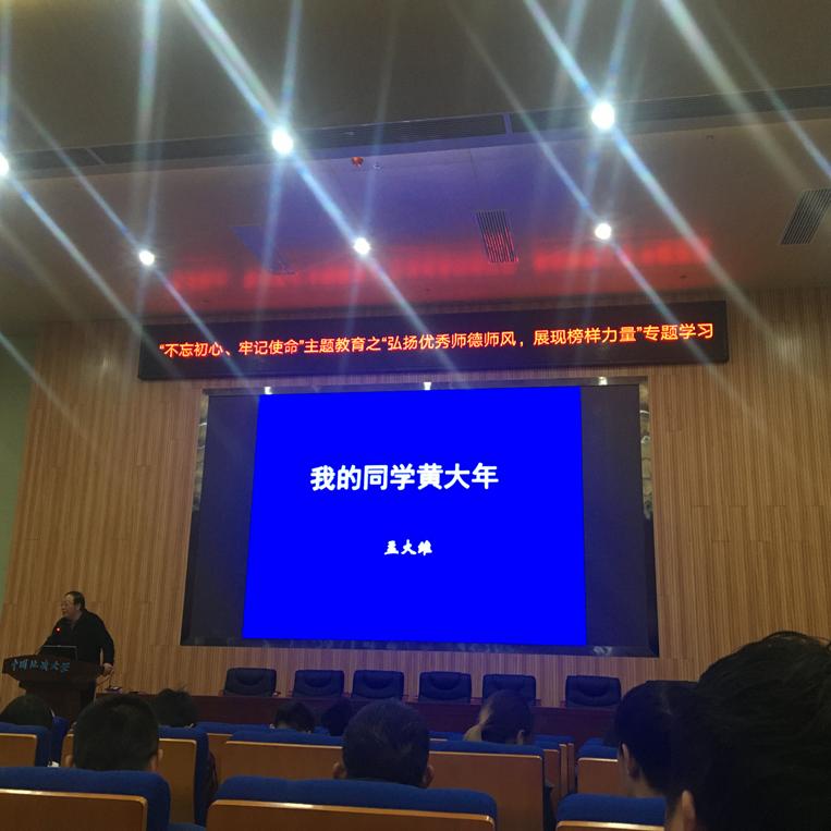 (通讯员:宋艺童)为贯彻和落实“不忘初心、牢记使命”主题教育的各项工作任务,强化“弘扬优秀师德师风,展现榜样力量”专题的学习效果,2019年11月21日下午,yl6809永利官网邀请了黄大年同志的大学同班、同宿舍同学,永利官网材化学院孟大维教授到永利官网做专题报告,介绍黄大年同志的先进事迹。本次学习活动由院党委书记吕军同志主持,学院全体师生党员参加。